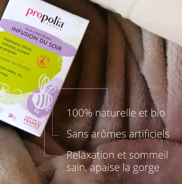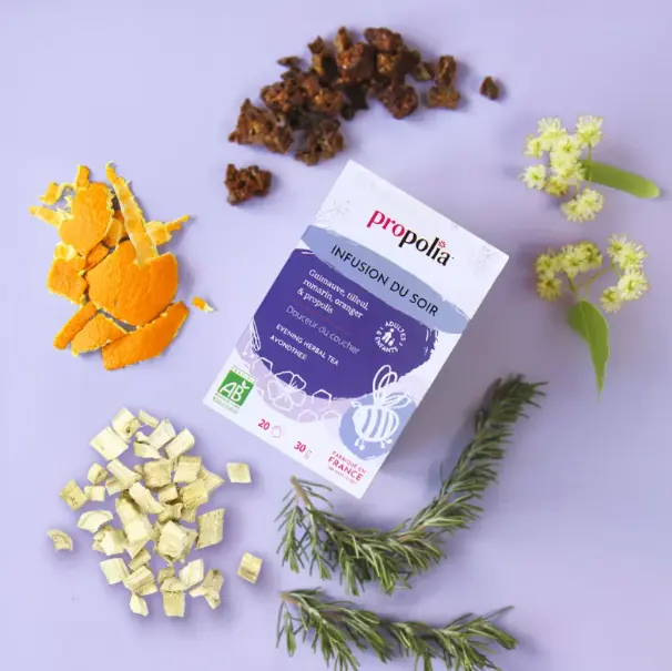 Idéale pour bien préparer votre corps et votre esprit au repos nocturne, cette infusion BIO est un mélange unique et subtil de propolis, sélectionnée pour sa pureté, et de 4 plantes reconnues. L'alliance du tilleul, de la guimauve, du romarin et de l'oranger donne à cette préparation un goût très doux et agréable à consommer au moment du coucher.