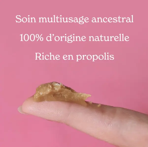 Beurre de karité*, extrait purifié de propolis (14,9%), cire d'abeilles, huile de sésame*, huile vierge de tournesol*, miel*