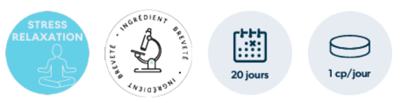 Oxyde de magnésium ; antiagglomérant : phosphate dicalcique ; extrait de mélisse bio feuille (Melissa officinalis) ; Extrait de rhodiola racine (Rhodiola rosea), anti-agglomérants : cellulose microcristalline, phosphate tricalcique ; extrait de safran stigmates Saffr’Activ® (Crocus sativus), anti-agglomérant : stéarate de magnésium ; fibres de carotte.