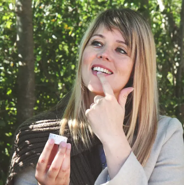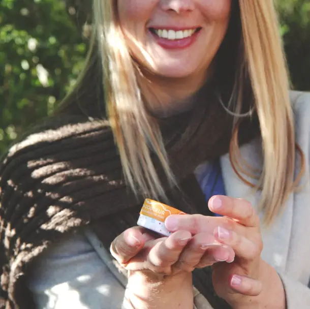 - Prélevez au doigt une petite quantité de baume et appliquez-la doucement sur les lèvres et leur contour.
