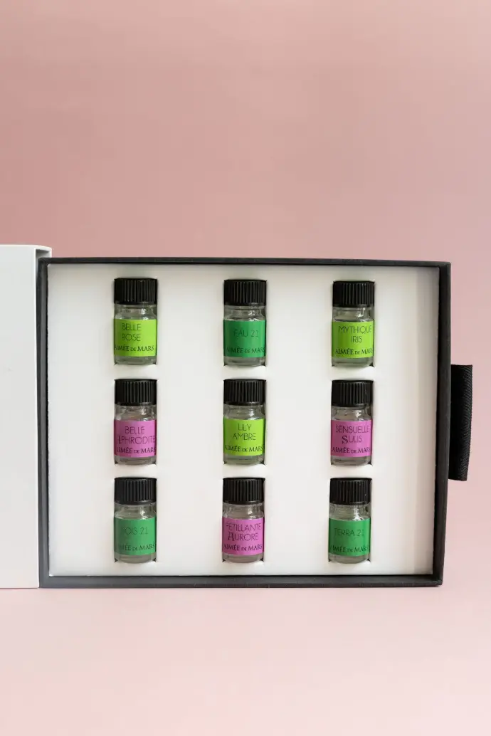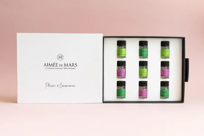 Retrouvez 9 minis flacons de parfum 100% naturel 2ml Aimée de Mars dans un coffret prêt à (s')offrir.